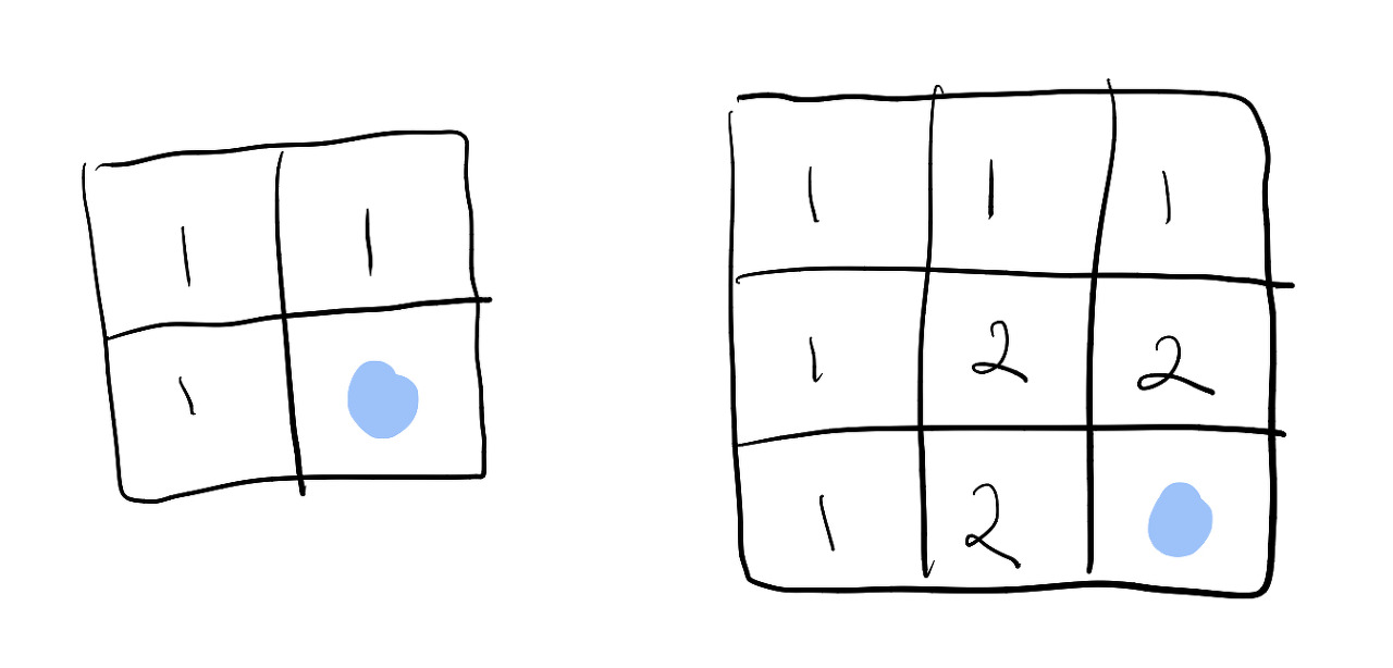 주어진 위치에서 가장 큰 정사각형의 한 변 길이를 저장하는 dp table을 만들면 된다. 아래의 그림에서 파랑색 점의 현재 위치를 [x][y]라고 할 때, [x-1][y-1], [x-1][y], [x][y-1]의 최솟값 + 1이 [x][y]의 값이 된다.