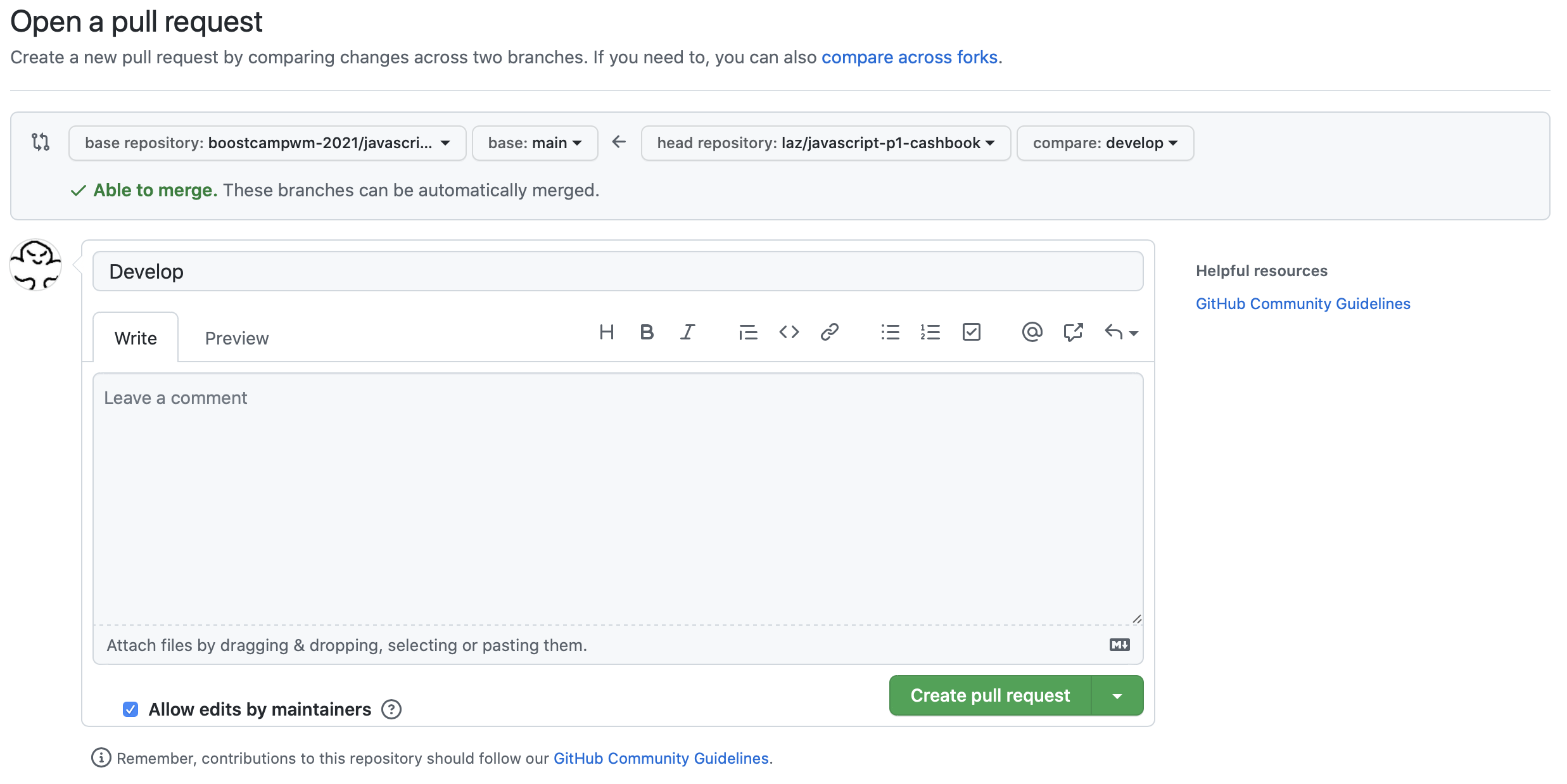 이후 원본 repository에서 PR을 merge하면 로컬의 변경 내용을 담은 커밋이 원본에도 반영되게 된다.