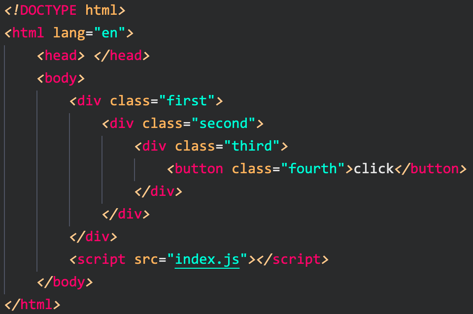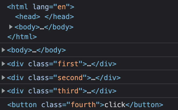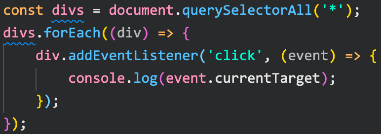 확인을 위해 html 모든 태그에 currentTarget을 출력하는 이벤트를 붙여보자.