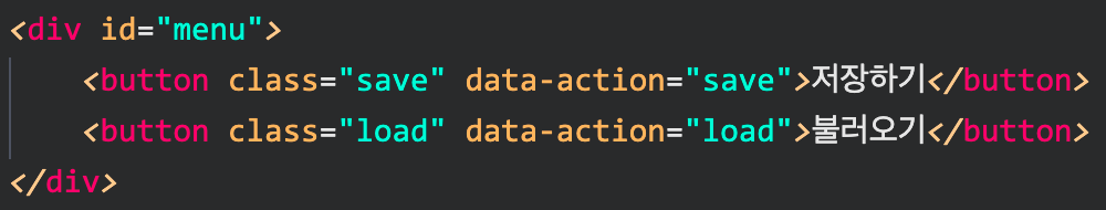 버튼의 부모인 메뉴 element에 하나의 event handler를 등록하고, 핸들러가 data-action 값을 이름으로 하는 함수를 호출하도록 만들면 된다.