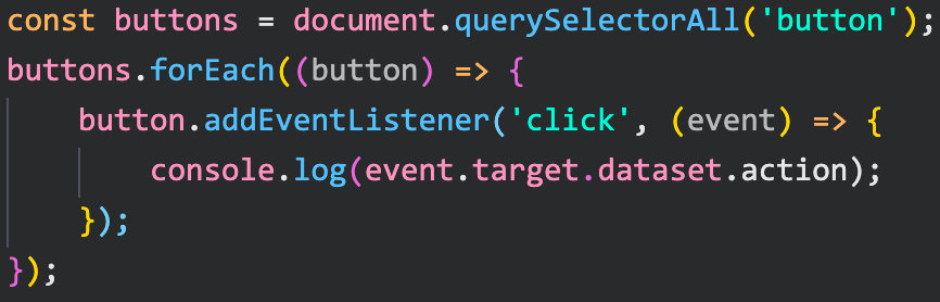버튼 태그를 모두 찾아 클릭시 data-action 값을 출력하는 핸들러를 등록했다.