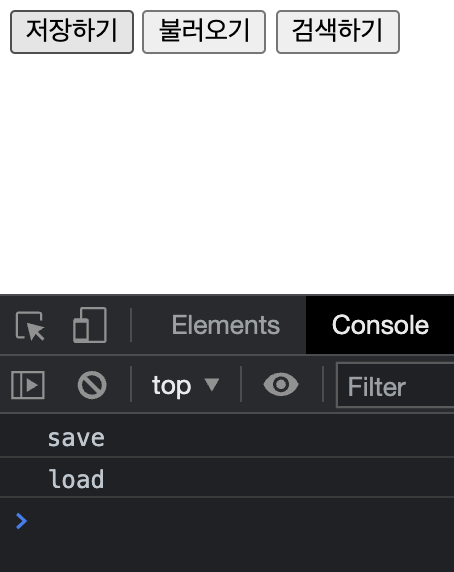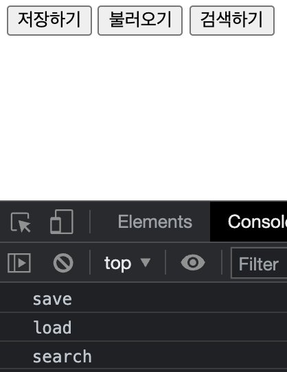 실행해보면 검색하기 버튼은 생겼지만 눌러도 값이 출력되지 않는다. 이벤트를 등록하는 시점이 버튼을 새로 만드는 시점보다 빠르기 때문에 생기는 현상이다.