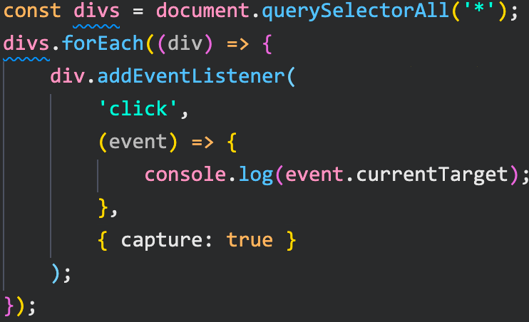 캡쳐링 단계에서 이벤트를 확인하려면 addEventListener의 capture옵션을 true로 설정하면 된다.