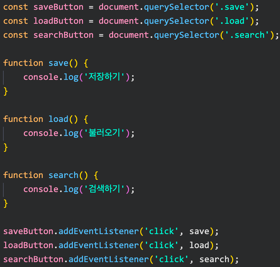 세개의 버튼이 있고, 각 버튼에 event handler를 등록해야 한다고 가정해보자.