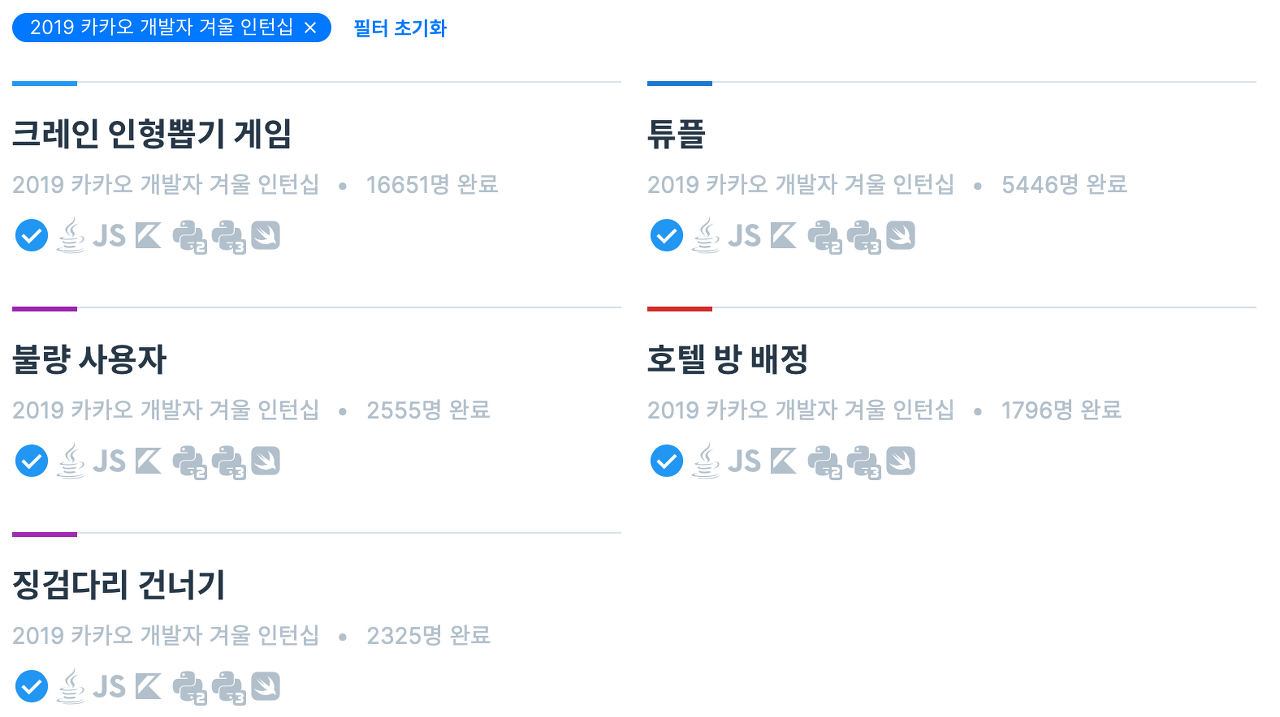다음주 토요일에 있는 2021 카카오 인턴 코딩테스트를 준비하기 위해 2019 카카오 겨울 인턴십 기출문제를 풀어봤다. 2020 카카오 인턴 코테와 마찬가지로 4솔.